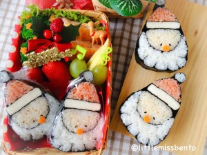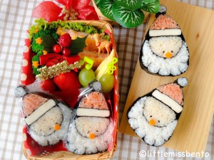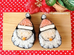 • Santa’s face (sushi rice with a little teriyaki sauce, carrot slice, black sesame seeds, seaweed)
