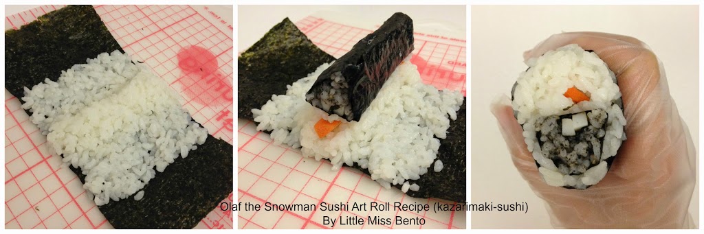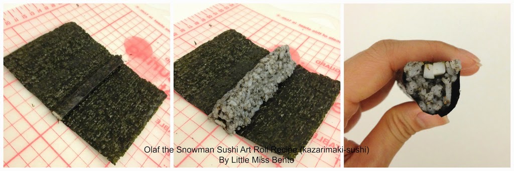 4. On 2/3 seaweed sheet, lay the fishcake strips from step 3 in the center. Add the rice from step 2, forming a mountain like shape. Roll the sushi, this completes Olaf’s mouth.